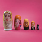 Set of 5 wooden nesting dolls that fit into one another. Each box opens up to reveal a star-studded dressing room!